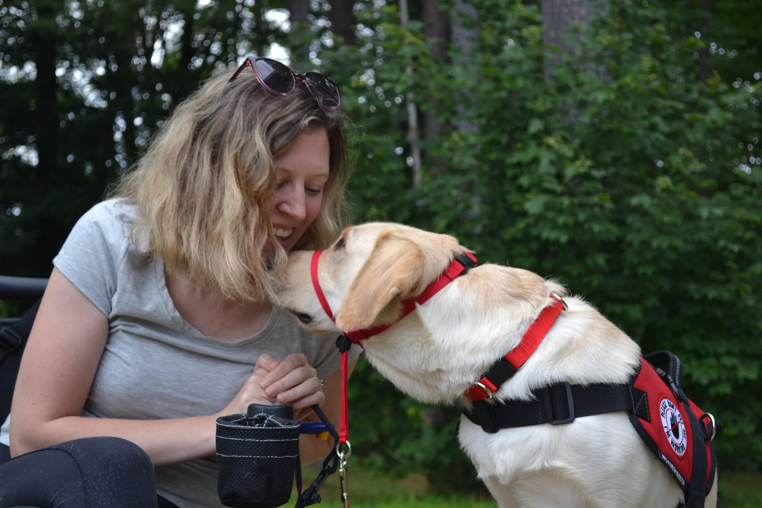 Mobility service dogs to assist individuals with daily tasks like picking up dropped items, pressing access door buttons, turning on lights and fetching the phone. We do not train for hearing, Autism, balance dogs, seizure alert dogs, guide dogs for the blind, diabetes alert dogs, dogs for people with Alzheimer's, emotional support, PTSD, or psychiatric dogs.