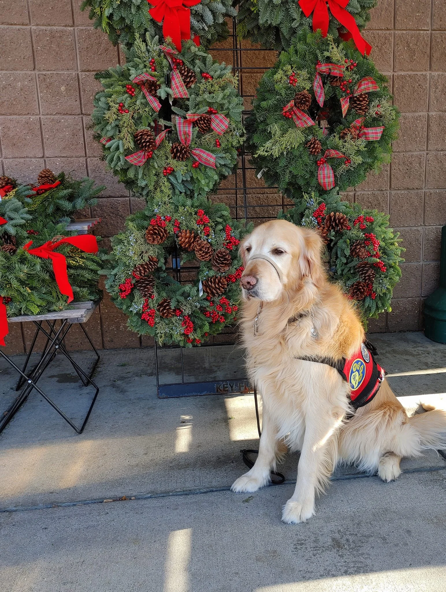 Golden Retriever with a harness sitting in front of holiday wreaths decorated with pine cones and red ribbons.