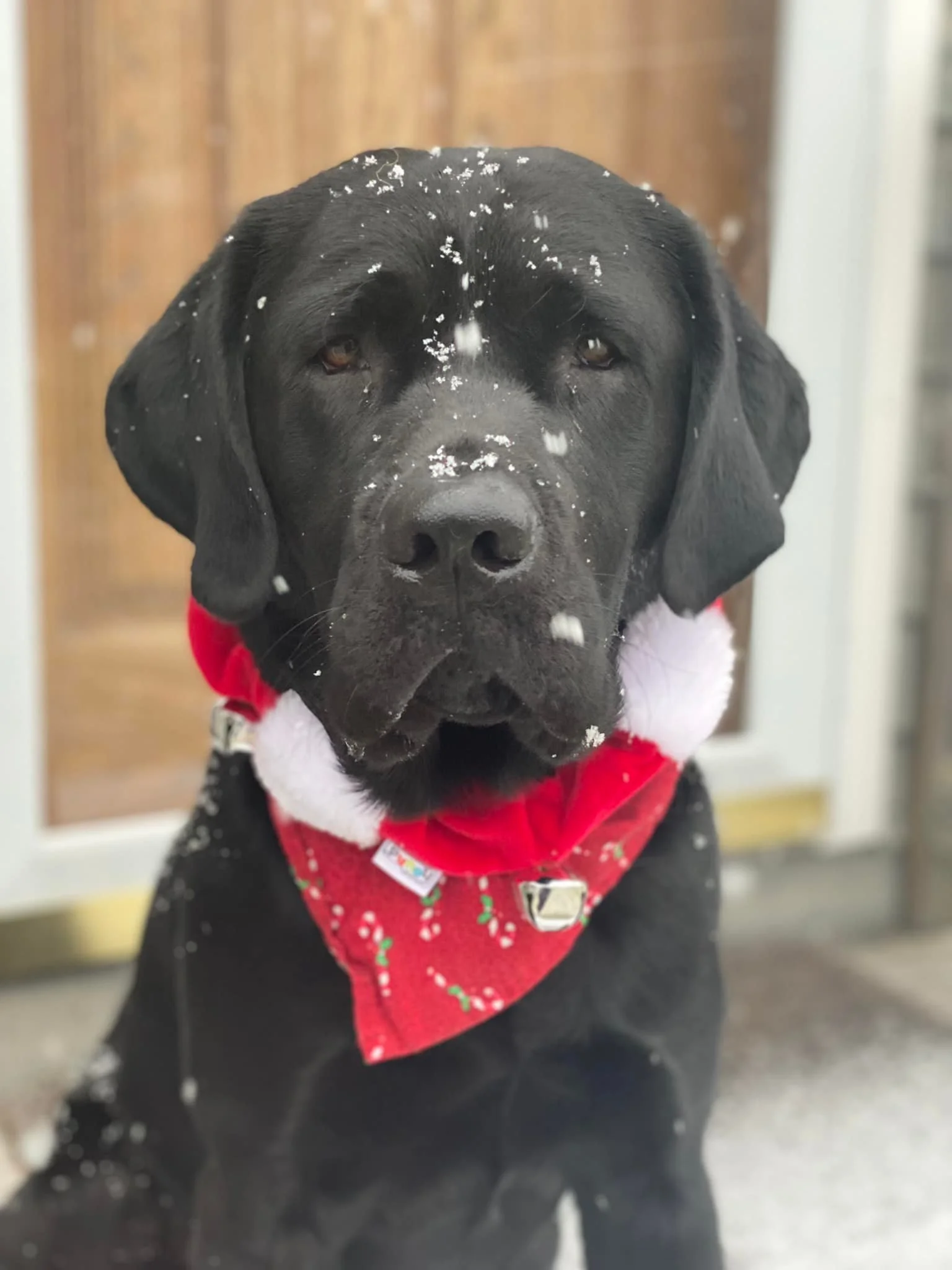 Black Labrador Retriever wearing a red Christmas bandana with snowflakes on its coat, standing in front of a door.