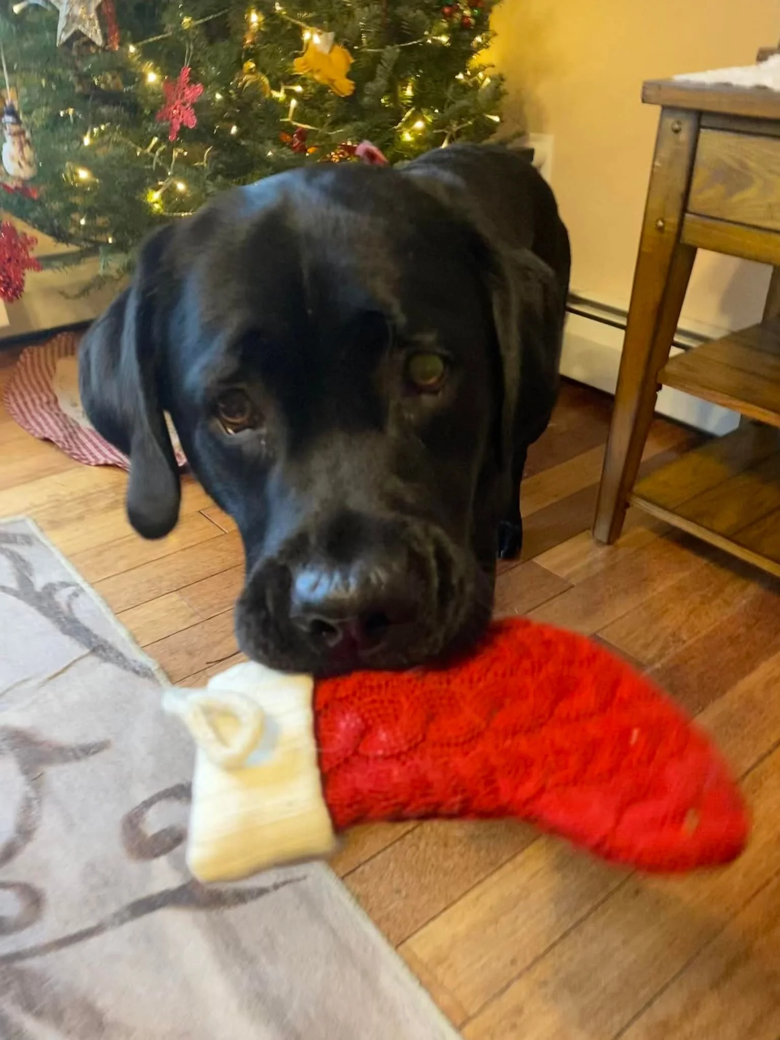 Black dog holding a red Christmas stocking in front of a decorated Christmas tree indoors.