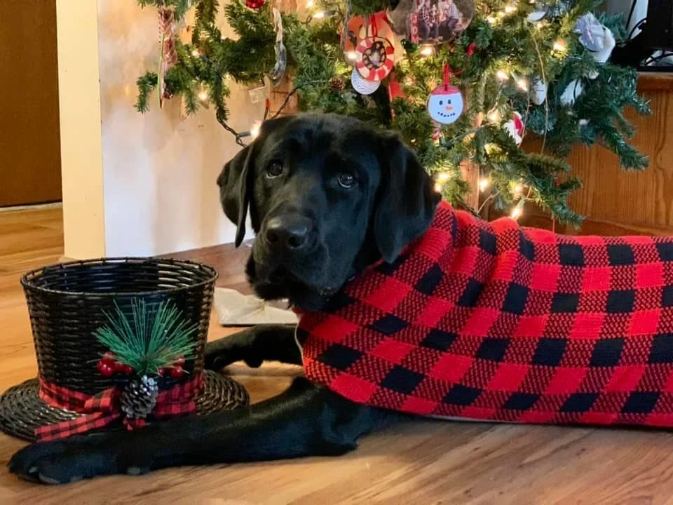Black Labrador Retriever lying on a wooden floor wearing a blue harness, with frosted Christmas tree branches in the background.