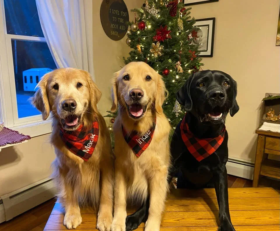 Three dogs wearing red and black plaid bandanas in front of a decorated Christmas tree indoors.