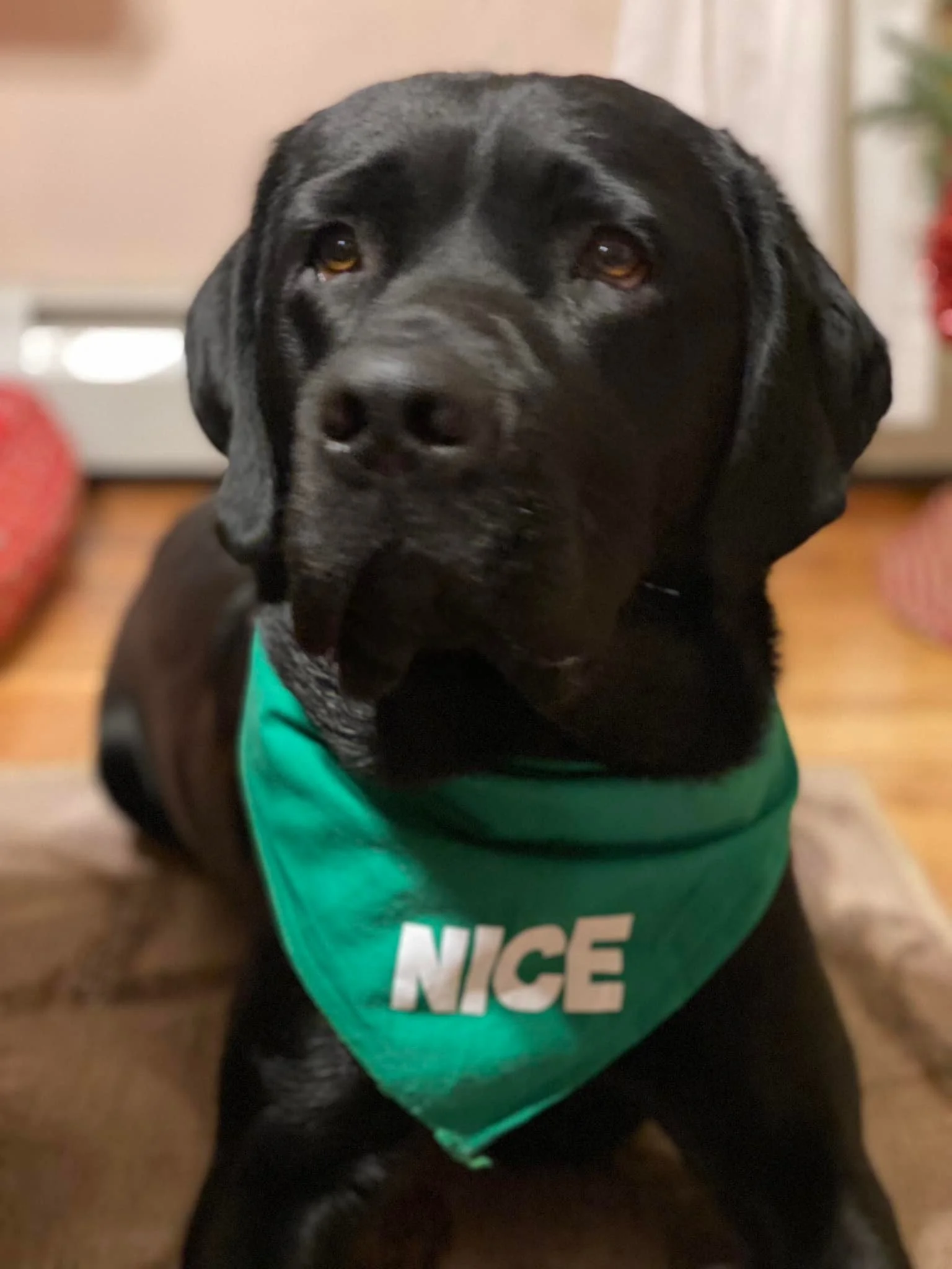 Black Labrador Retriever wearing a green bandana with 'NICE' written in white letters.