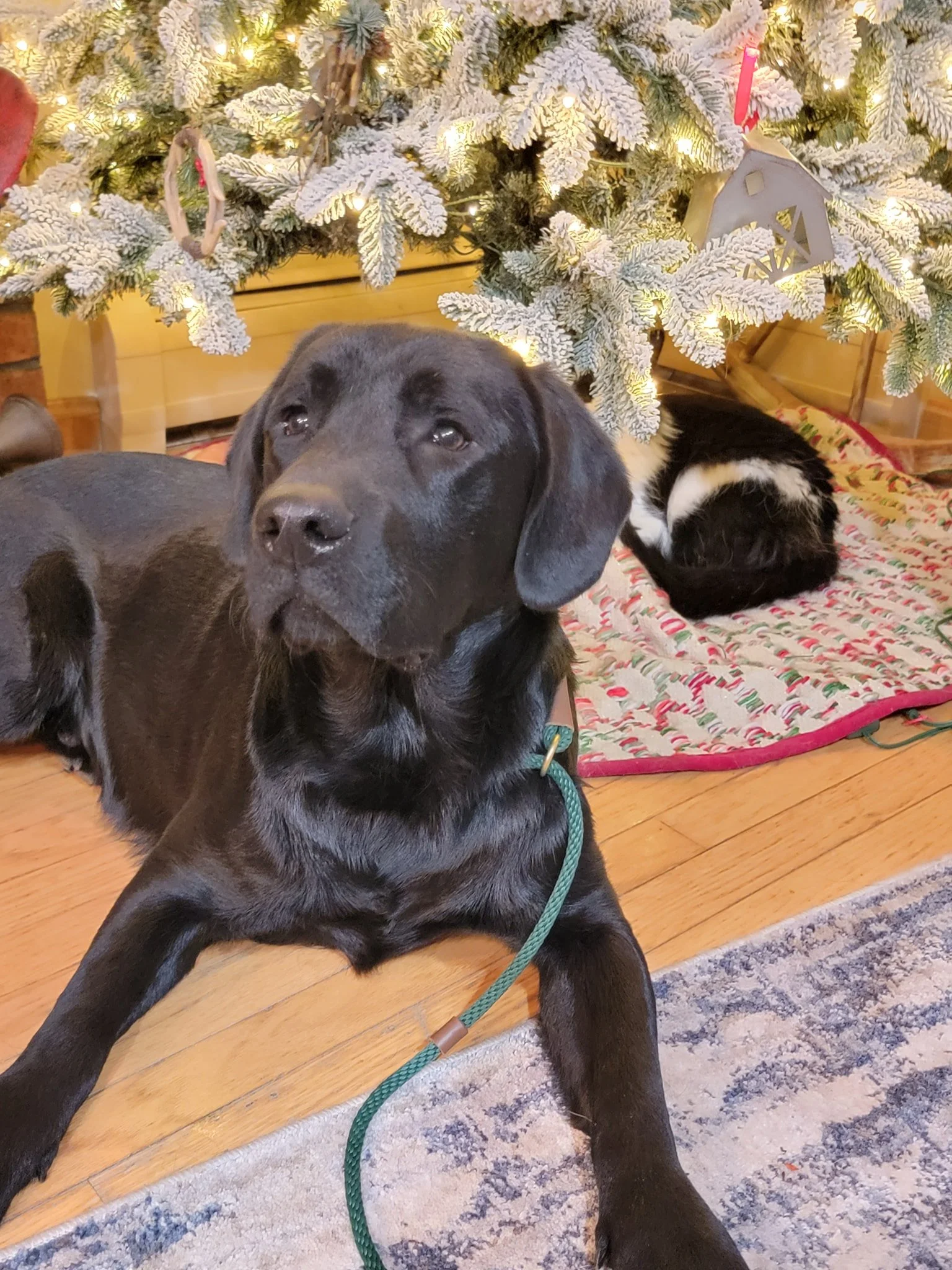 Black dog lying on a rug in front of a decorated Christmas tree with lights. A black and white cat is curled up nearby on a festive tree skirt.